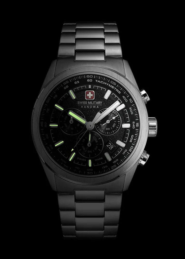 Мужские швейцарские часы Swiss Military Hanowa SMWGI0004204 – это элегантные часы, сочетающие в себе классический дизайн и современную функциональность. Корпус из нержавеющей стали диаметром 43 мм сбалансирован и элегантен. Сапфировое стеклоСапфировое стеклоПрочный и надёжный материал из кристалла сапфира синтетического происхождения, характеризующийся особой твёрдостью и устойчивостью к царапинам и повреждениям. с антибликовым покрытием защищает циферблат от царапин и обеспечивает отличную читаемость при любом освещении. Браслет с раскладной застёжкойРаскладная застёжкаТакой тип застёжки используется только на браслетах из металла. Она никогда не раскрывается полностью, происходит разделение на 2 и более частей. Раскладывающая застёжка снизит вероятность потери часов к минимуму. идеально дополняют дизайн часов, обеспечивая комфортное ношение. Люминесцентное покрытиеЛюминесцентное покрытиеПозволяет считывать показания времени в темноте. Производители наносят на стрелки, часовые индексы, безель или поверхность циферблата светонакопительный состав, дающий холодное свечение. стрелок и меток позволит вам следить за временем даже в полной темноте. Циферблат с точным механизмом хронографаХронографФункция позволяет измерять отрезки времени с особой точностью: часы, минуты, секунды. Верным признаком хронографа является наличие на циферблате 3 дополнительных окошек-счётчиков. и хорошо заметным индикатором даты в положении между 4 и 5 часов. ТахиметрТахиметрРазмеченная шкала, располагается на ободке или безеле часов. Тахиметр позволяет рассчитать скорость на определённом участке пути, расстояние измеряется в километрах или милях. по внешнему краю. Водонепроницаемость до 100 метров хорошо подходят для повседневного ношения и занятий водными видами спорта.