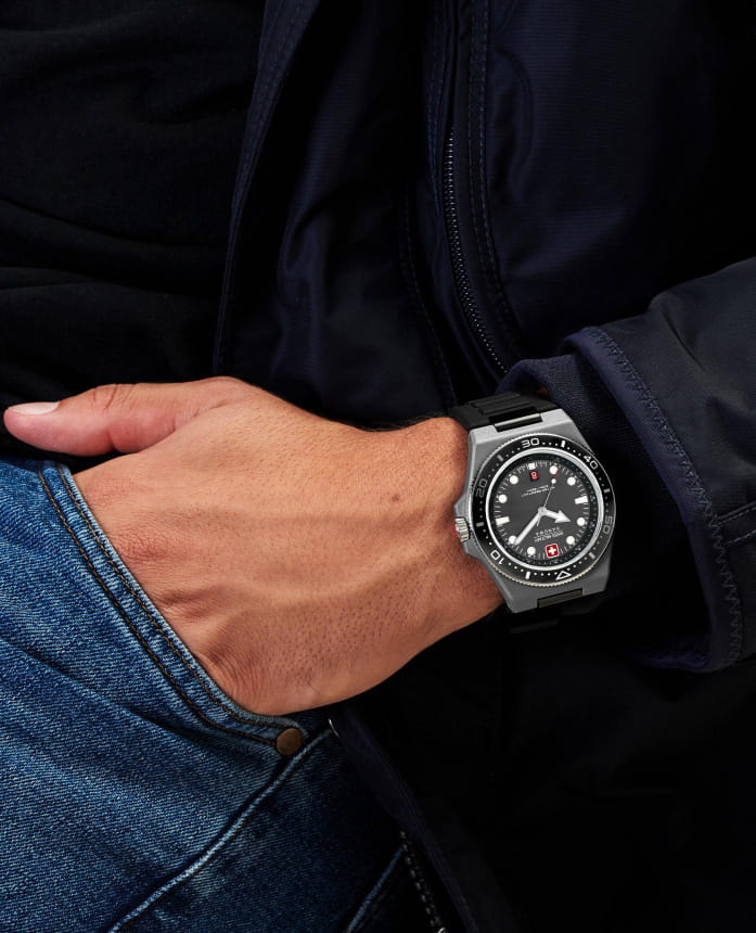 Мужские швейцарские часы Swiss Military Hanowa Ocean Pioneer SMWGN0001182, кварцевый механизм с высокой точностью. Сапфировое стеклоСапфировое стеклоПрочный и надёжный материал из кристалла сапфира синтетического происхождения, характеризующийся особой твёрдостью и устойчивостью к царапинам и повреждениям. устойчивое к появлению царапин, обладающее высокой прозрачностью. Корпус часов изготовлен из переработанного океанического пластика. БезельБезельВнешний ободок, закрепляющий стекло. В спортивных часах так называется поворотное кольцо с делениями на циферблате, выполняет роль таймера – замеряет отрезки времени на шкале. Неподвижный безель – элемент декора. Однонаправленно вращающийся безель на дайверских часах позволяет фиксировать моменты погружения и выныривания на поверхность. из нержавеющей стали с PVD-покрытиемPVDУльтратонкое покрытие наносится в технике вакуумного напыления, сочетает в себе нитрид титана особой прочности со слоем золота или оксида хрома. Несёт в себе декоративную или защитную функцию.. Стрелки с люминесцентным покрытиемЛюминесцентное покрытиеПозволяет считывать показания времени в темноте. Производители наносят на стрелки, часовые индексы, безель или поверхность циферблата светонакопительный состав, дающий холодное свечение.. Окошко даты в положении 6 часов. Класс водозащиты: 200 метров, позволит плавать, нырять и заниматься другими водными видами спорта. Силиконовый ремешок на стандартной застежке.