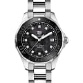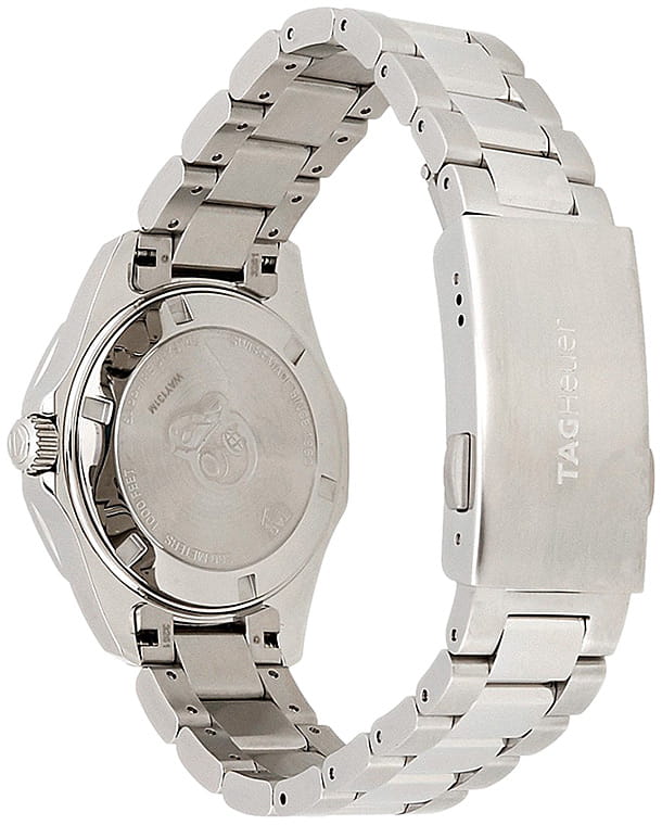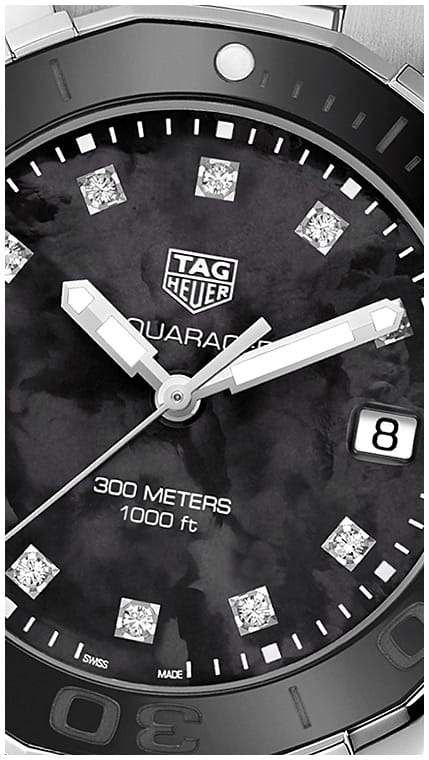 TAG Heuer Aquaracer WAY131M.BA0748 — элегантные женские часы, сочетающие стиль и функциональность. Корпус диаметром 35 мм и толщиной 10,75 мм выполнен из полированной нержавеющей стали, обеспечивая долговечность и устойчивость к коррозии. Лакированный циферблат оснащён накладными часовыми метками и стрелками с люминесцентным покрытиемЛюминесцентное покрытиеПозволяет считывать показания времени в темноте. Производители наносят на стрелки, часовые индексы, безель или поверхность циферблата светонакопительный состав, дающий холодное свечение., обеспечивающим отличную читаемость в любых условиях освещения. Его поверхность защищена сапфировым стекломСапфировое стеклоПрочный и надёжный материал из кристалла сапфира синтетического происхождения, характеризующийся особой твёрдостью и устойчивостью к царапинам и повреждениям., устойчивым к царапинам. Циферблат украшен 11 бриллиантами. Часы оснащены точным кварцевым механизмом, обеспечивающим стабильное отображение времени. Функциональность включает индикацию часов, минут, секунд и даты, расположенной на отметке «3 часа». БезельБезельВнешний ободок, закрепляющий стекло. В спортивных часах так называется поворотное кольцо с делениями на циферблате, выполняет роль таймера – замеряет отрезки времени на шкале. Неподвижный безель – элемент декора. Однонаправленно вращающийся безель на дайверских часах позволяет фиксировать моменты погружения и выныривания на поверхность. однонаправленный вращающийся, выполнен из стали, устойчивой к царапинам. Водозащита до 300 метров (30 бар) делает модель подходящей для дайвинга и активного образа жизни. Стальной браслет на раскладной застёжкеРаскладная застёжкаТакой тип застёжки используется только на браслетах из металла. Она никогда не раскрывается полностью, происходит разделение на 2 и более частей. Раскладывающая застёжка снизит вероятность потери часов к минимуму..