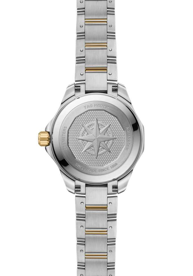 Женские элегантные кварцевые швейцарские часы TAG Heuer Aquaracer Professional 200 WBP1323.BB0004, механизм с высокой точностью. Сапфировое стеклоСапфировое стеклоПрочный и надёжный материал из кристалла сапфира синтетического происхождения, характеризующийся особой твёрдостью и устойчивостью к царапинам и повреждениям. устойчивое к появлению царапин, обладающее высокой прозрачностью. Матовый циферблат с синими солнечными лучами красиво и изысканно контрастирует с блеском элементов, покрытых желтым золотом. Класс водозащиты: 200 метров, позволит плавать, нырять и заниматься другими водными видами спорта. Корпус часов изготовлен из стали, безельБезельВнешний ободок, закрепляющий стекло. В спортивных часах так называется поворотное кольцо с делениями на циферблате, выполняет роль таймера – замеряет отрезки времени на шкале. Неподвижный безель – элемент декора. Однонаправленно вращающийся безель на дайверских часах позволяет фиксировать моменты погружения и выныривания на поверхность. из стали с 18-каратным золотом18-каратное золотоОбозначение по каратной системе пробирования, оно показывает, сколько драгоценного металла содержится в изделии. 18 карат - в составе 75% чистого золота, соответствует 750 пробе.
