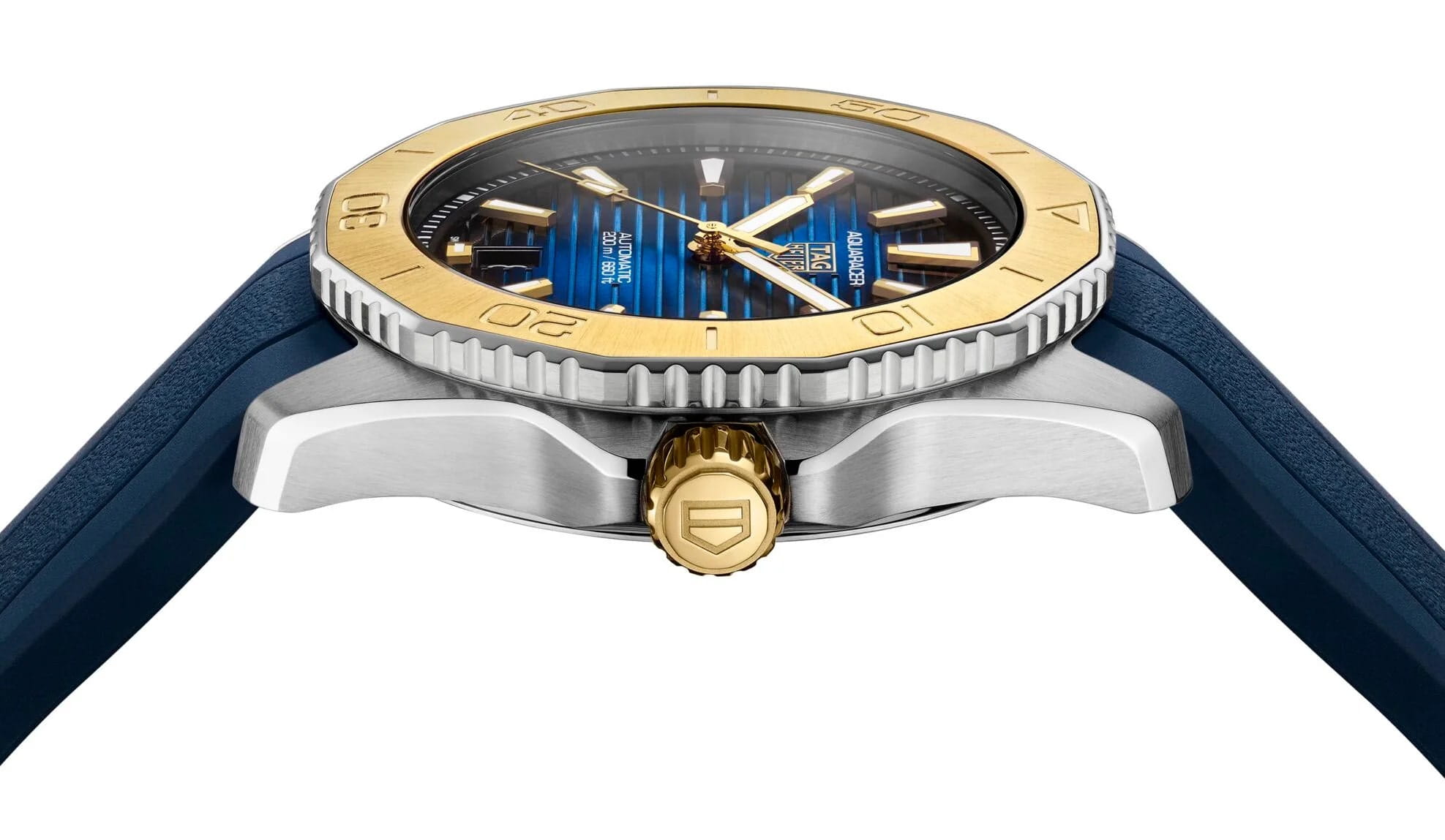 Часы TAG Heuer Aquaracer Professional 200 WBP2150.FT6210. Сочетая в себе прочность желтого золота и универсальность синего каучукового ремешка, этот роскошный TAG Heuer Aquaracer отличается спортивной элегантностью. Очень разборчивые благодаря светящимся позолоченным стрелкам и индексам, великолепно контрастирующим с темно-синим циферблатом, эти эффектные часы готовы к крайностям.