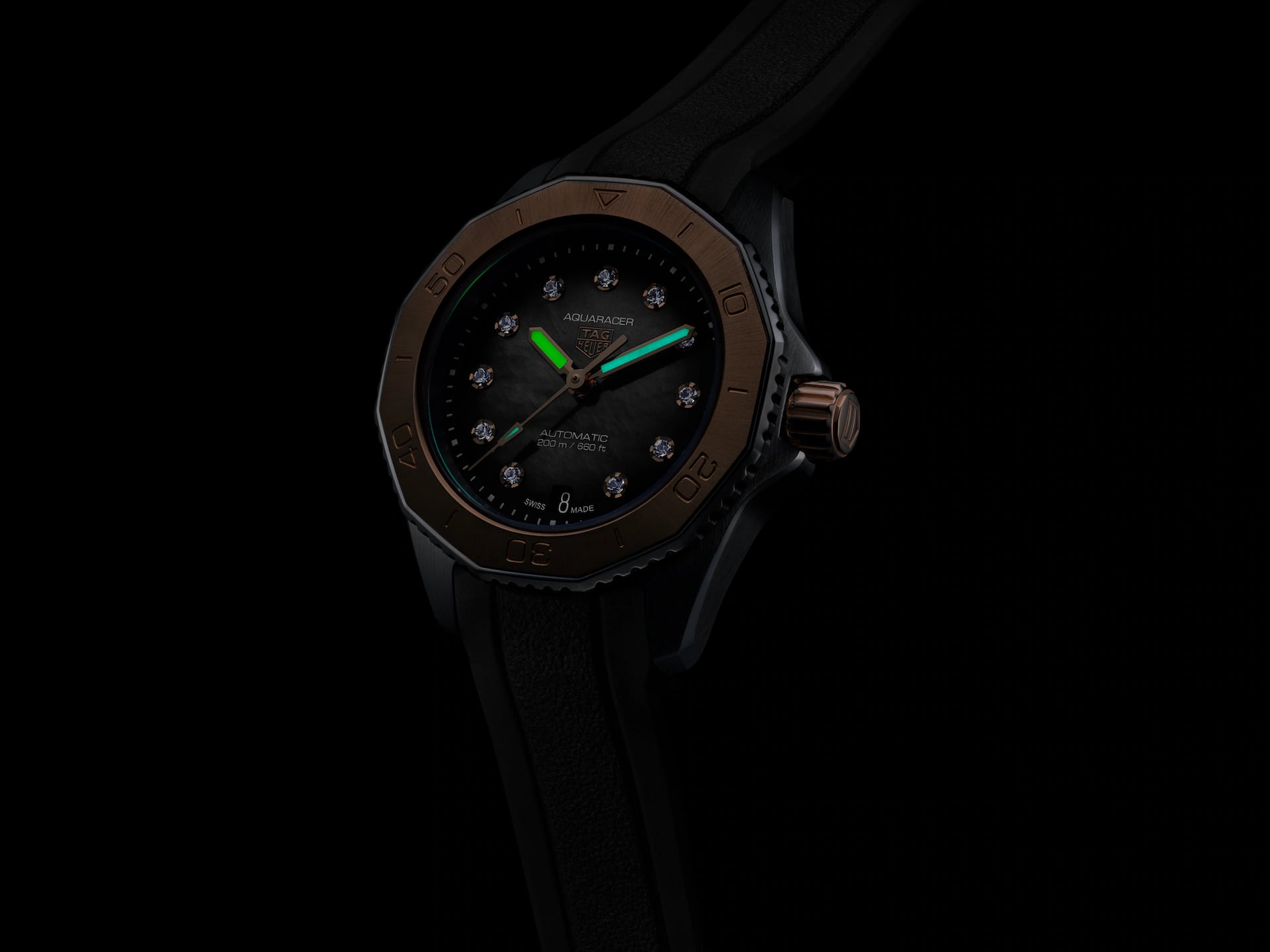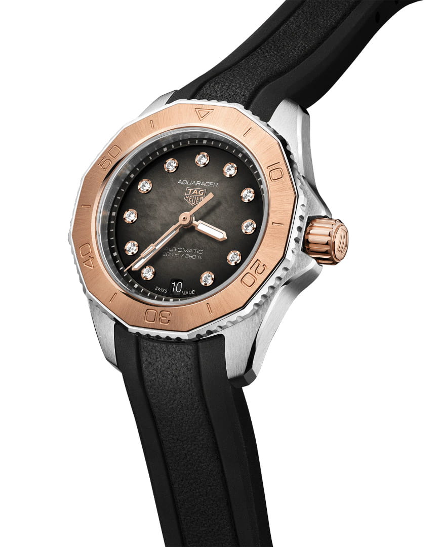 Часы TAG Heuer Aquaracer Professional 200 WBP2450.FT6215. Сочетая в себе прочность розового золота и универсальность черного каучукового ремешка, этот роскошный TAG Heuer Aquaracer отличается спортивной элегантностью. Сверкающие бриллианты диаметром 1,4 мм (0,107 карата). Очень разборчивые благодаря светящимся позолоченным стрелкам и индексам, великолепно контрастирующим с черным циферблатом, эти эффектные часы готовы к крайностям.