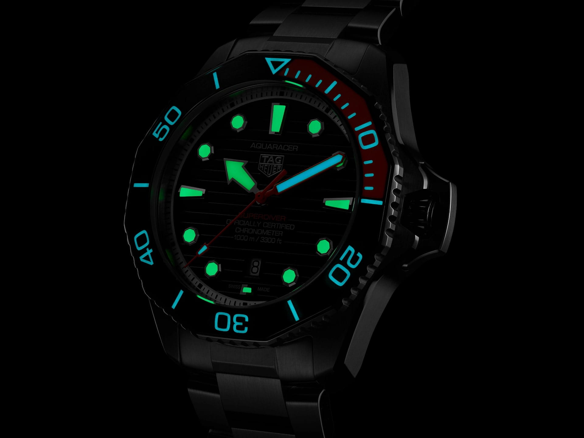 Мужские часы TAG Heuer Aquaracer Professional 200 Date WBP5A8A.BF0619 с 45-миллиметровым титановым корпусом оснащены защитой заводной головки и гелиевым выпускным клапаном, рассчитанным на погружение на глубину 1000 метров. Часы из титана, сертифицированные по стандарту ISO 6425:2018. Циферблат с люминесцентным покрытиемЛюминесцентное покрытиеПозволяет считывать показания времени в темноте. Производители наносят на стрелки, часовые индексы, безель или поверхность циферблата светонакопительный состав, дающий холодное свечение. стрелок и меток, дополнен сапфировым стекломСапфировое стеклоПрочный и надёжный материал из кристалла сапфира синтетического происхождения, характеризующийся особой твёрдостью и устойчивостью к царапинам и повреждениям., устойчивым к появлению царапин и обладающее высокой прозрачностью.