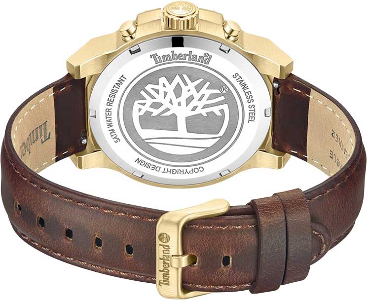 Американские мужские часы-хронографХронографФункция позволяет измерять отрезки времени с особой точностью: часы, минуты, секунды. Верным признаком хронографа является наличие на циферблате 3 дополнительных окошек-счётчиков. Timberland Fast Strike TDWGB0056002 имеют кварцевый механизм с высокой точностью. Класс водозащиты: 50 метров, позволит защитить корпус от случайных брызг или капель дождя. Корпус часов изготовлен из стали с PVD-покрытиемPVDУльтратонкое покрытие наносится в технике вакуумного напыления, сочетает в себе нитрид титана особой прочности со слоем золота или оксида хрома. Несёт в себе декоративную или защитную функцию.. Прочное минеральное стеклоМинеральное стеклоМинеральное стекло представляет собой искусственно выращенный минерал кварца. Такое стекло отличается особой устойчивостью к повреждениям и царапинам. Уступает по некоторым качествам сапфировому стеклу.. Стрелки c люминесцентным покрытиемЛюминесцентное покрытиеПозволяет считывать показания времени в темноте. Производители наносят на стрелки, часовые индексы, безель или поверхность циферблата светонакопительный состав, дающий холодное свечение.. Кожаный ремешок с классической застежкой и системой быстрой замены. Окошко даты находится в положении между 4 и 5 часов.