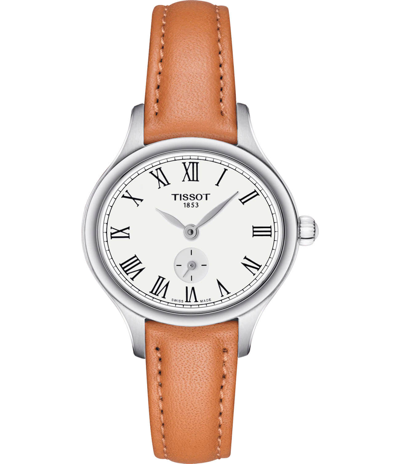 На заводной головке расположился утончённый жемчужный кабашон, придающий модели женственный облик. Дополнительное очарование достигается благодаря плавным контурам и вогнутому безелюБезельВнешний ободок, закрепляющий стекло. В спортивных часах так называется поворотное кольцо с делениями на циферблате, выполняет роль таймера – замеряет отрезки времени на шкале. Неподвижный безель – элемент декора. Однонаправленно вращающийся безель на дайверских часах позволяет фиксировать моменты погружения и выныривания на поверхность., римским цифрам. Высокоточный кварцевый механизм ETA 980.153. Светлый коричневый ремешок из натуральной кожи. Отдельный мини-счётчик секунд. Сапфировое стекло отличается устойчивостью к царапинам. Функция EOLEOLПредставляет собой систему, уведомляющую владельца часов о необходимости замены элемента питания. За 2 недели до полного разряда батарейки секундная стрелка перестаёт ходить чётко и начинает перепрыгивать на 3-4 деления.. Габариты: 24,4 x 27,2 x 7,7 мм.