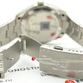 Белые часовые метки и стрелки чётко выделяются на синем циферблате, облегчая читаемость показателей. Наручные часы выполнены из титана, материал отличается долговечностью и не вызывает аллергии. Кварцевый калибр ETA 955.112. Водостойкость 100 метров. Прочное сапфировое стекло. Индикатор разряда элемента питания. Окошко даты. Габариты: 39 x 39 x 9 мм.