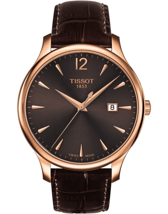 TISSOT T0636103629700 T-Classic Tradition Quartz - женские кварцевые наручные часы Корпус этих часов среднего размера (42 мм) и выполнен из нержавеющей стали L316 с PVD-покрытием цвета розового золота Модель TISSOT T0636103629700 T-Classic Tradition Quartz имеет устойчивое к царапинам сапфировое стекло, ремешок из натуральной кожи коричневого цвета, коричневый циферблат Калибр механизма: ETA F06111 Класс водозащиты: 30 м / 3 АТМ (защита от брызг и случайных капель) Дополнительные функции и особенности: отображение числа Полная заводская комплектация TISSOT: оригинальные часы, фирменная коробка, инструкция, сервисная книжка, роман о часовой фабрике, миникаталог, замшевый фирменный чехол черного цвета для хранения и/или переноски часов, кассовый и товарный чеки Международная гарантия 2 года Производство и сборка: Швейцария