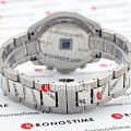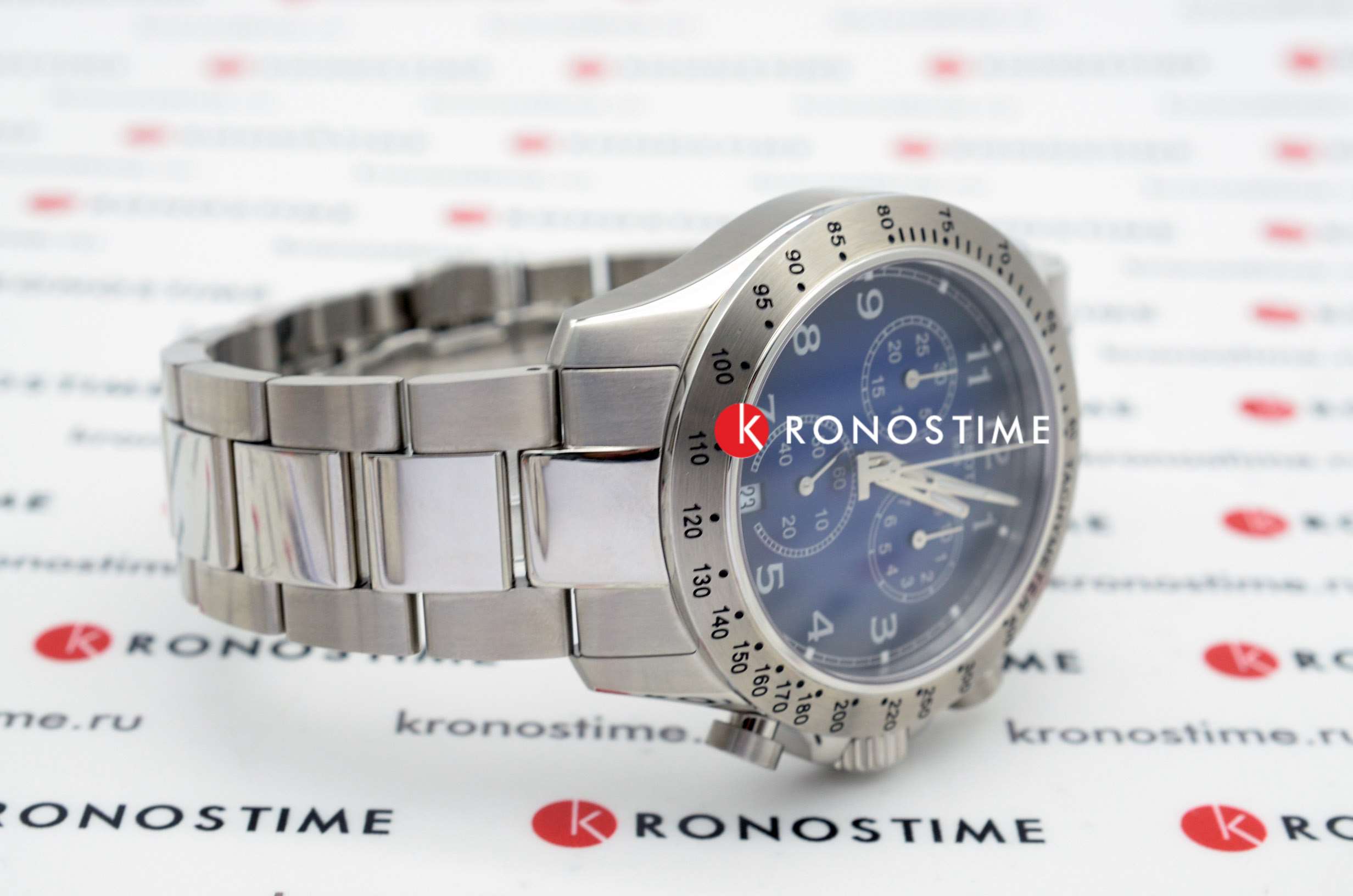 Сдержанный тёмно-синий циферблат со счётчиками хронографаХронографФункция позволяет измерять отрезки времени с особой точностью: часы, минуты, секунды. Верным признаком хронографа является наличие на циферблате 3 дополнительных окошек-счётчиков. акцентирует всё внимание на себе. Стрелки имеют люминесцентную подсветкуЛюминесцентное покрытиеПозволяет считывать показания времени в темноте. Производители наносят на стрелки, часовые индексы, безель или поверхность циферблата светонакопительный состав, дающий холодное свечение., чтобы использование часов в темноте не вызывало затруднений. Привлекательный внешний вид. Кварцевый механизм ETA G10.212. Хирургическая сталь устойчива к повреждениям и ударам. Водозащита до 10 бар. . Секундомер, тахиметрТахиметрРазмеченная шкала, располагается на ободке или безеле часов. Тахиметр позволяет рассчитать скорость на определённом участке пути, расстояние измеряется в километрах или милях., календарь. Габариты: 42,5 x 42,5 x 11,2 мм.