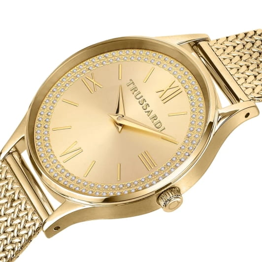Итальянские женские часы Trussardi T-Star R2453152506 - это стильный женский аксессуар, который сочетает элегантный дизайн и практичность. Корпус выполнен из нержавеющей стали с IP-покрытиемIP-покрытиеМетод ионного напыления. Демонстрирует повышенную устойчивость к истиранию, окислению и химическим веществам. Под воздействием высокого давления и температуры около 1500°C молекулы металла надёжно соединяются с частицами корпуса часов., что обеспечивает долговечность и утончённый внешний вид. Надежное минеральное стеклоМинеральное стеклоМинеральное стекло представляет собой искусственно выращенный минерал кварца. Такое стекло отличается особой устойчивостью к повреждениям и царапинам. Уступает по некоторым качествам сапфировому стеклу. защищает циферблат от царапин и обеспечивает долговечность. Циферблат украшен стеклянными кристаллами. Модель оснащена кварцевым механизмом, обеспечивающим высокую точность хода. Браслет из нержавеющей стали с IP-покрытиемIP-покрытиеМетод ионного напыления. Демонстрирует повышенную устойчивость к истиранию, окислению и химическим веществам. Под воздействием высокого давления и температуры около 1500°C молекулы металла надёжно соединяются с частицами корпуса часов. с раскладным замкомРаскладной замокДанный вариант застежки используется только на часах с металлическим браслетом. Отличительная особенность такого крепления в том, что длина браслета становится универсальной и вы можете самостоятельно отрегулировать нужный вам размер – застежка просто двигается по браслету часов. обеспечивает комфортное ношение. Водозащита 50 метров позволит защитить корпус от случайных брызг или капель дождя. Эта модель – отличный выбор для тех, кто ищет сочетание стиля, качества и функциональности. Часы станут не только полезным аксессуаром, но и выразительным элементом вашего имиджа.