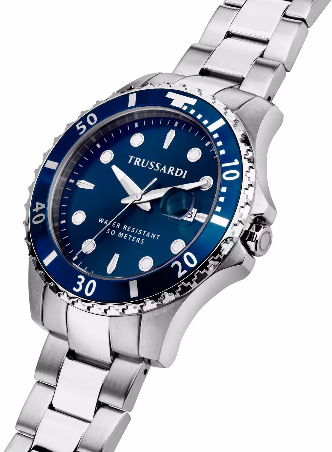 Итальянские мужские часы Trussardi City Life R2453169006 - это стильный мужской аксессуар, который сочетает элегантный дизайн и практичность. Корпус выполнен из нержавеющей стали с безелемБезельВнешний ободок, закрепляющий стекло. В спортивных часах так называется поворотное кольцо с делениями на циферблате, выполняет роль таймера – замеряет отрезки времени на шкале. Неподвижный безель – элемент декора. Однонаправленно вращающийся безель на дайверских часах позволяет фиксировать моменты погружения и выныривания на поверхность. с IP-покрытиемIP-покрытиеМетод ионного напыления. Демонстрирует повышенную устойчивость к истиранию, окислению и химическим веществам. Под воздействием высокого давления и температуры около 1500°C молекулы металла надёжно соединяются с частицами корпуса часов., что обеспечивает долговечность и утончённый внешний вид. Надежное минеральное стеклоМинеральное стеклоМинеральное стекло представляет собой искусственно выращенный минерал кварца. Такое стекло отличается особой устойчивостью к повреждениям и царапинам. Уступает по некоторым качествам сапфировому стеклу. защищает циферблат от царапин и обеспечивает долговечность. Модель оснащена кварцевым механизмом, обеспечивающим высокую точность хода. Браслет из нержавеющей стали с раскладной застёжкойРаскладная застёжкаТакой тип застёжки используется только на браслетах из металла. Она никогда не раскрывается полностью, происходит разделение на 2 и более частей. Раскладывающая застёжка снизит вероятность потери часов к минимуму. обеспечивает комфортное ношение. Водозащита 50 метров позволит защитить корпус от случайных брызг или капель дождя. Окошко даты в положении 3 часов. Стрелки метки оснащены люминесцентным покрытиемЛюминесцентное покрытиеПозволяет считывать показания времени в темноте. Производители наносят на стрелки, часовые индексы, безель или поверхность циферблата светонакопительный состав, дающий холодное свечение., обеспечивающим отличную видимость даже при слабом освещении. Эта модель – отличный выбор для тех, кто ищет сочетание стиля, качества и функциональности. Часы станут не только полезным аксессуаром, но и выразительным элементом вашего имиджа.