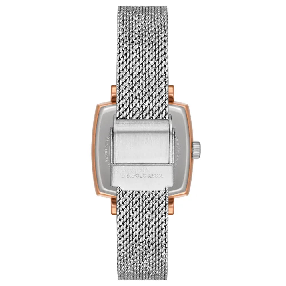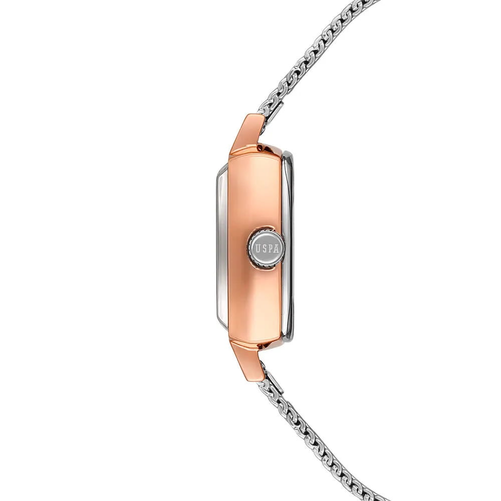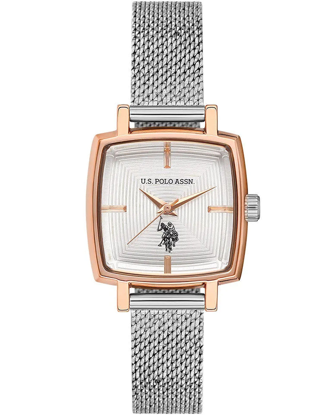 Женские наручные часы U.S. Polo Assn. Stile USPA2066-05 — это стильный и лаконичный аксессуар, выполненный в форме квадрата. Модель изготовлена из стали с PVD-покрытиемPVDУльтратонкое покрытие наносится в технике вакуумного напыления, сочетает в себе нитрид титана особой прочности со слоем золота или оксида хрома. Несёт в себе декоративную или защитную функцию., придающий благородный внешний вид и устойчивость к царапинам. Циферблат дополнен секундной стрелкой, обеспечивающей точность отсчёта времени. Защиту циферблата обеспечивает минеральное стеклоМинеральное стеклоМинеральное стекло представляет собой искусственно выращенный минерал кварца. Такое стекло отличается особой устойчивостью к повреждениям и царапинам. Уступает по некоторым качествам сапфировому стеклу., устойчивое к мелким повреждениям. Часы оснащены кварцевым механизмом, гарантирующим точность и минимальное обслуживание. Водонепроницаемость 3 АТМ позволяет использовать часы в повседневных условиях — при мытье рук или под лёгким дождём. Браслет выполнен в технике миланской сетки из стали и оснащён раскладным замкомРаскладной замокДанный вариант застежки используется только на часах с металлическим браслетом. Отличительная особенность такого крепления в том, что длина браслета становится универсальной и вы можете самостоятельно отрегулировать нужный вам размер – застежка просто двигается по браслету часов., обеспечивающей комфорт и уверенную фиксацию на запястье. Толщина корпуса составляет 10 мм, а его размер 26 мм, что делает часы компактными и удобными в носке. Эти часы станут универсальным аксессуаром для уверенных в себе женщин, которые ценят сочетание стиля, качества и эстетики — идеальный выбор для повседневного образа и торжественных случаев.