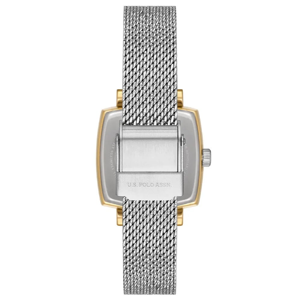 Женские наручные часы U.S. Polo Assn. Stile USPA2066-06 — это стильный и лаконичный аксессуар, выполненный в форме квадрата. Модель изготовлена из стали с PVD-покрытиемPVDУльтратонкое покрытие наносится в технике вакуумного напыления, сочетает в себе нитрид титана особой прочности со слоем золота или оксида хрома. Несёт в себе декоративную или защитную функцию., придающий благородный внешний вид и устойчивость к царапинам. Циферблат дополнен секундной стрелкой, обеспечивающей точность отсчёта времени. Защиту циферблата обеспечивает минеральное стеклоМинеральное стеклоМинеральное стекло представляет собой искусственно выращенный минерал кварца. Такое стекло отличается особой устойчивостью к повреждениям и царапинам. Уступает по некоторым качествам сапфировому стеклу., устойчивое к мелким повреждениям. Часы оснащены кварцевым механизмом, гарантирующим точность и минимальное обслуживание. Водонепроницаемость 3 АТМ позволяет использовать часы в повседневных условиях — при мытье рук или под лёгким дождём. Браслет выполнен в технике миланской сетки из стали и оснащён раскладным замкомРаскладной замокДанный вариант застежки используется только на часах с металлическим браслетом. Отличительная особенность такого крепления в том, что длина браслета становится универсальной и вы можете самостоятельно отрегулировать нужный вам размер – застежка просто двигается по браслету часов., обеспечивающей комфорт и уверенную фиксацию на запястье. Толщина корпуса составляет 10 мм, а его размер 26 мм, что делает часы компактными и удобными в носке. Эти часы станут универсальным аксессуаром для уверенных в себе женщин, которые ценят сочетание стиля, качества и эстетики — идеальный выбор для повседневного образа и торжественных случаев.