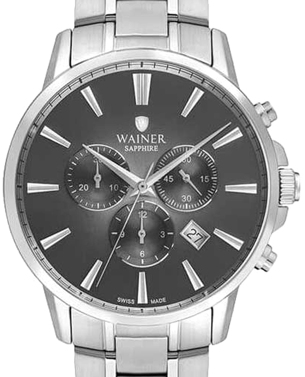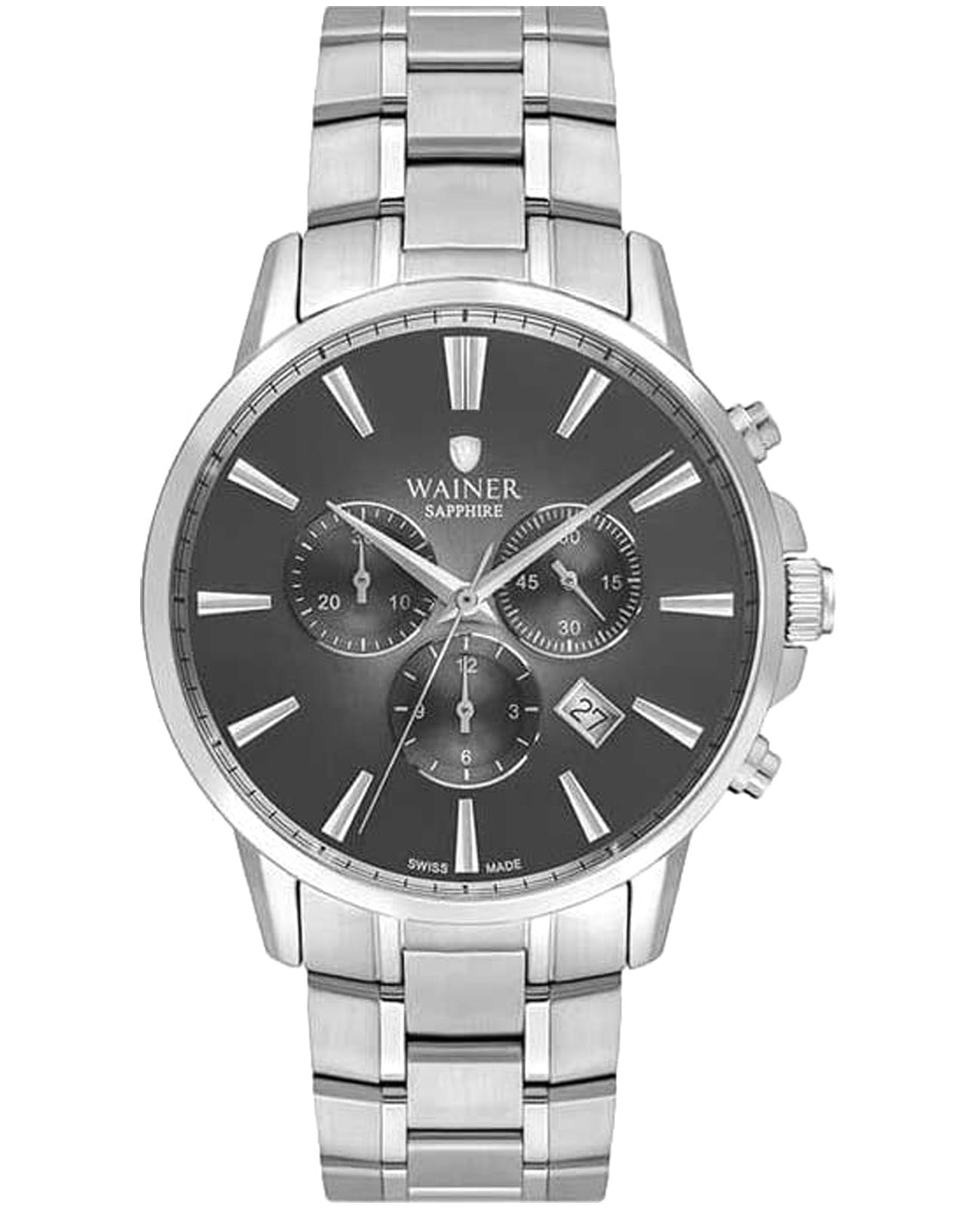 Мужские кварцевые часы-хронографХронографФункция позволяет измерять отрезки времени с особой точностью: часы, минуты, секунды. Верным признаком хронографа является наличие на циферблате 3 дополнительных окошек-счётчиков. с секундомеромСекундомерСекундоме́р — прибор, способный измерять интервалы времени с точностью до долей секунды. Wainer WA.19333-C сочетает элегантный дизайн и высокое качество исполнения. Корпус выполнен из нержавеющей стали 316L серебристого цвета, диаметром 44 мм и толщиной 10 мм, обеспечивает прочность и долговечность. Циферблат с метками в виде штрихов и украшен фирменным логотипом Wainer. Сапфировое стеклоСапфировое стеклоПрочный и надёжный материал из кристалла сапфира синтетического происхождения, характеризующийся особой твёрдостью и устойчивостью к царапинам и повреждениям. защищает дисплей от царапин и механических повреждений. Окошко даты находится в положении между отметками 4 и 5 часов. Стальной браслет на застёжке-бабочкеЗастёжка "бабочка"Такой вид застёжки дополняется предохранителями, помогающими избежать случайного раскрытия браслета. Обладают изящным исполнением. обеспечивает комфортное ношение. Водонепроницаемость до 50 метров позволит защитить корпус от случайных брызг или капель дождя. Рифленая заводная головка с защитой. Wainer — это стильный и надежный аксессуар для тех, кто ценит швейцарское качество и современные технологии.